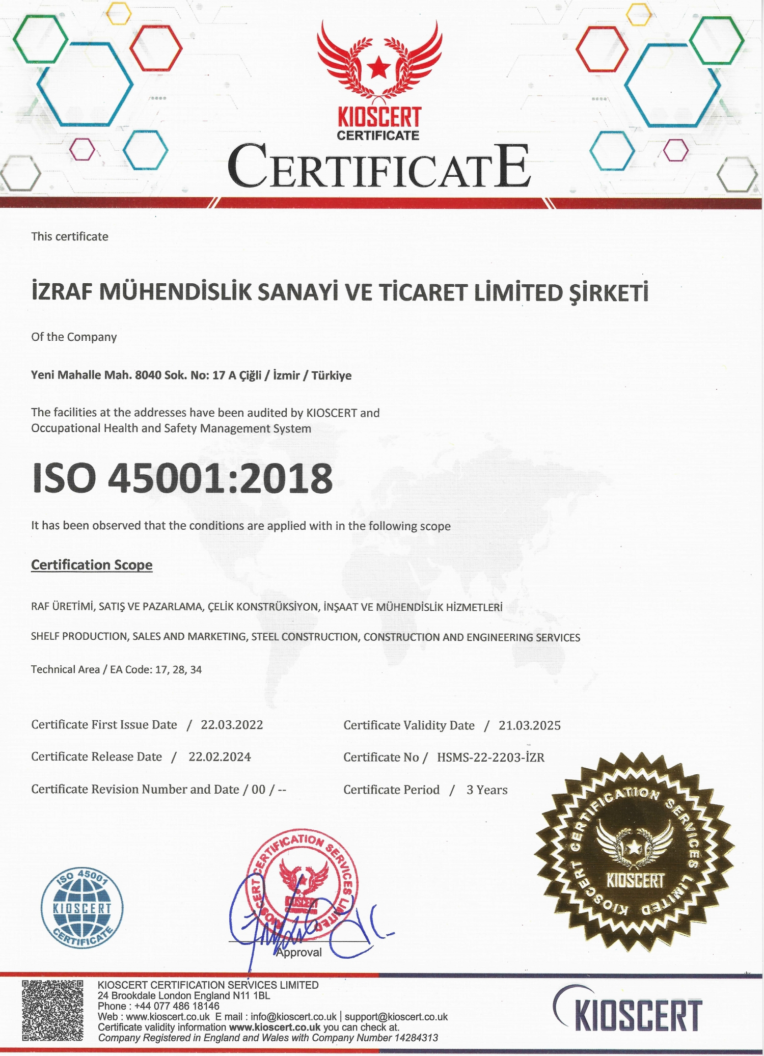 İşyerimize gelen ziyaretçiler ve misafirlerimize, tüm çalışanlarımıza sağlıklı ve güvenli çalışma koşulları temin etmek, teknolojik gelişmeleri takip ederek ve son teknolojiyi kullanarak, iş kazalarının ve meslek hastalıklarının oluşmadan önlenmesini sağlamak ve eksiksiz bir şekilde uygulanması ve sürekli iyileştirilmesi amacıyla İSG Yönetim Sisteminin gerekliliklerini uygulayarak sertifikamızı aldık.